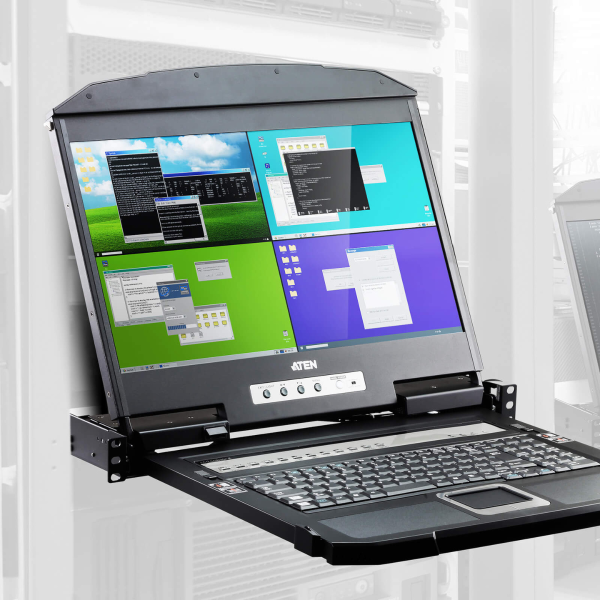 The ATEN CL3884NW LCD KVM Switch offers a space-saving, streamlined approach to KVM switch technology by integrating a keyboard, a 18.5″ LED-backlit LCD monitor, and a touchpad in a 1U rack-mountable slide housing. The dual rail design enables the LCD monitor, keyboard and touchpad to operate independently of each other. To maximize space utilization, the keyboard and touchpad modules can slide back to “hideaway” when not in use, while the LCD monitor rotates back, flush against the rack, to allow convenient monitoring of computer activity.