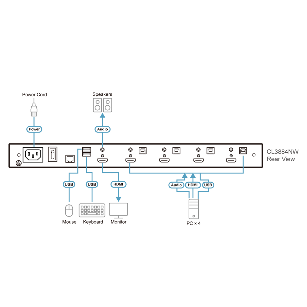 For added convenience, users can choose to manage the computer from an external console. The CL3884NW features a USB peripheral port on the unit’s front panel, ports for the external KVM console (USB keyboard/mouse and HDMI monitor) on the rear panel, and audio ports for connecting audio speakers.