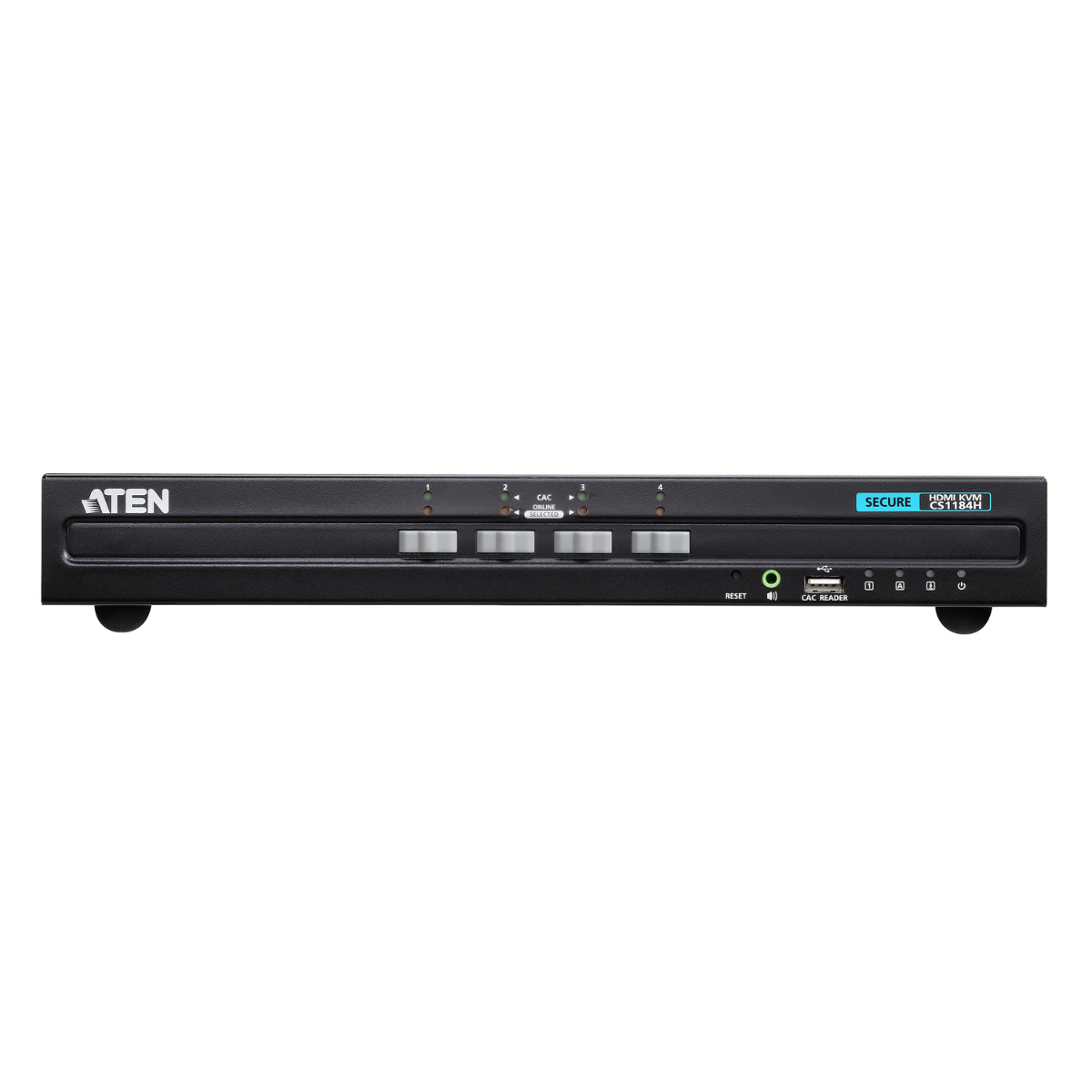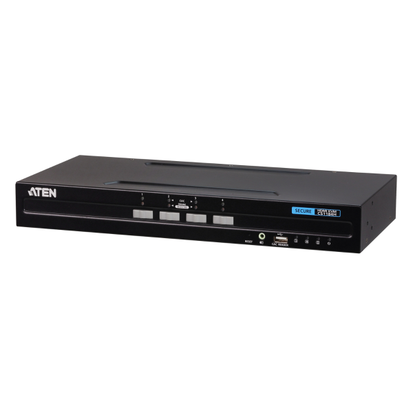 ATEN PSS PP v3.0 Secure KVM Switch (CS1184H) provides isolation between computer sources and peripherals while sharing a single keyboard, mouse, monitor, speaker set, and Common Access Card (CAC) reader between connected computers of various security classifications. Compliance with PSS PP v3.0 ensures peripheral sharing capabilities provide maximum user data security when switching port focus, preventing unauthorized data flows or leakage between connected sources. Key protections include isolation and unidirectional data flow, restricted peripheral connectivity and filtering, user data protection, configurable device filtering and management, and always-on tamper-proof design, keeping sensitive assets isolated and providing advanced security and a user friendly design for instantly secure deployment.