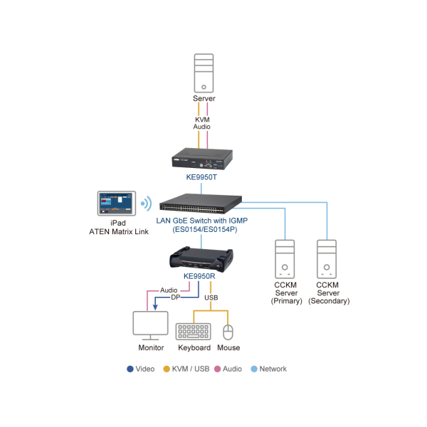 When integrated with the KVM over IP Matrix Manager (CCKM), the KE9950 supports more advanced features such as boundless switching, “Push” and “Pull”, video wall and multi-display setups, and profile scheduling that provide uninterrupted access with quick and easy control tools to use the KE9950 over a network.