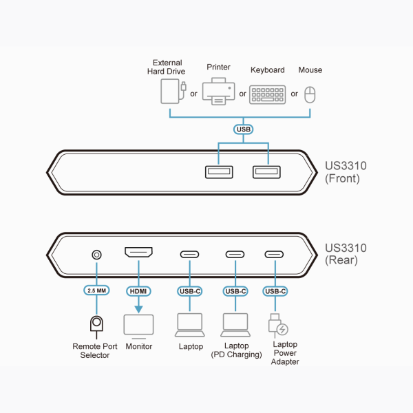 The US3310 is a 2-Port 4K HDMI USB-C KVM Dock Switch with Power Pass-through that features the combination of a multiport dock, and allows one button switching between laptops and Android smart phones. With one set of display, keyboard, and mouse, users get to seamlessly control two different systems and save desk space. Thanks to the remote port selector, users are allowed to put US3310 at the most convenient location or hide it under the desk to do the quick switch.