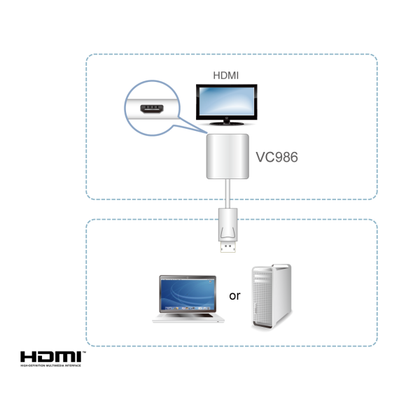 The VC986 is an active DisplayPort to HDMI adapter that allow you to connect your Mini DisplayPort/DisplayPort output device to the HDMI input of a 4K TV or other display.