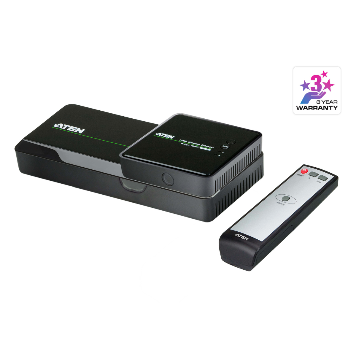 The VE809 HDMI Wireless Extender extends your HDMI display up to 30 m* from the HDMI source using wireless technology. Easily connect two HDMI devices to an HDTV wirelessly with crystal clear image quality capable of streaming Full 1080p with 5.1 channel digital audio and 3D technology. The IR remote control allows you to switch between HDMI source devices from the receiver side, remotely; and allows you to watch a local and wirelessly connected HDTV- simultaneously. The VE809 consists of a wireless audio/ video transmitter and receiver. Consolidate your HDMI electronics and use the VE809 as a wireless 2-port HDMI switch to connect remote devices such as Blu-ray players and HD Cable boxes to design your own custom wireless entertainment space.