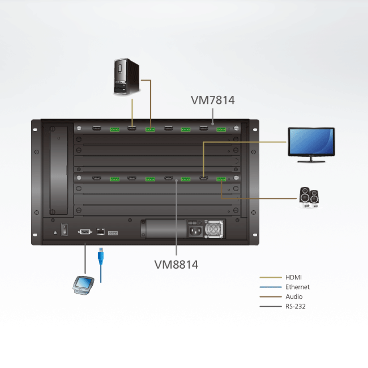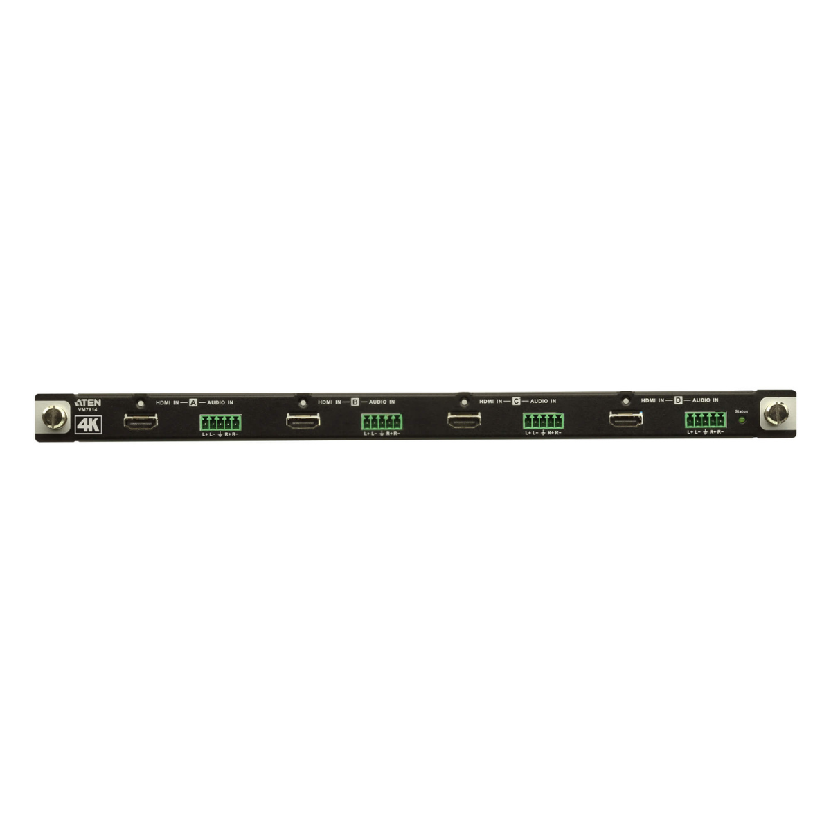 The VM7814 is a 4K HDMI input board that works with an ATEN Modular Matrix Switch to offer an easy way to route 4 HDMI sources to 4 displays. In addition to the HDMI interface that carries digital A/V signals, the VM7814 is equipped with 4 stereo audio input ports that allow stereo audio embedding.
