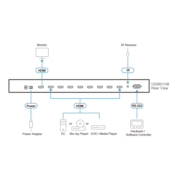 - 1x VS0801HB 8-port True 4K HDMI Switch