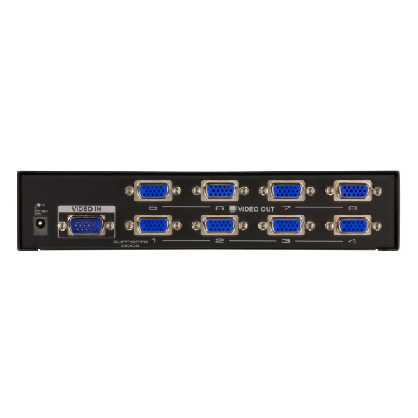 The VS138A Video Splitter is a boosting device that duplicates a video signal from one source to 8 output devices. Cascadable to three levels, the VS138A provides up to 512 video signals, in addition to extending transmission distance up to 30 m, making it excellent for public broadcast systems.