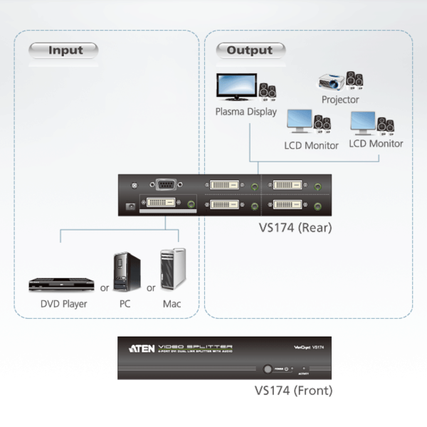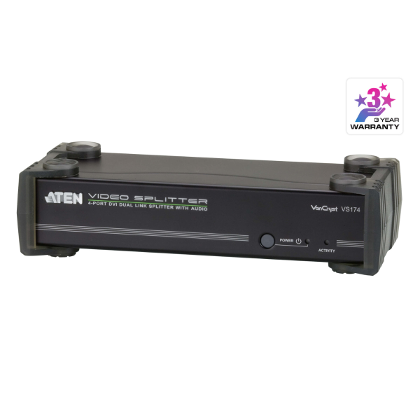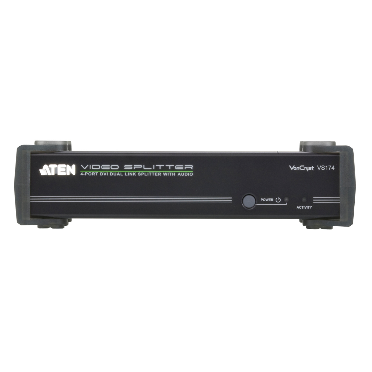 The VS174 4-Port DVI Dual Link Splitter with Audio combines DVI quality video and audio, taking signals from an audio/ video source and replicating them to four audio/video outputs. This video splitter uses dual link technology, which offers high bandwidth capacity for added transmission power and faster refresh rates, thereby providing better video quality of viewing resolutions up to 2560 x 1600.