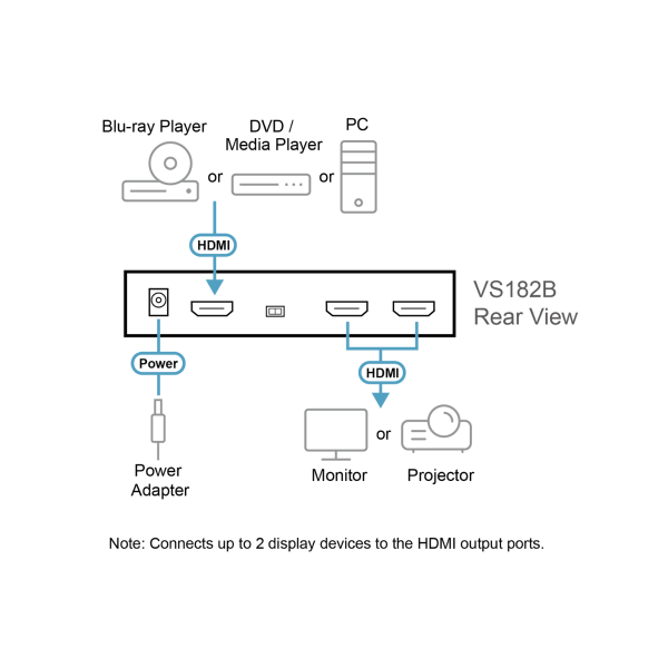 The VS182B True 4K HDMI Splitter is the perfect solution for anyone who needs to send one source of digital high definition video to two displays at the same time. It supports all HDMIenabled equipment, such as DVD players, satellite set- top boxes and all HDMI monitors, displays, projectors, or TVs.