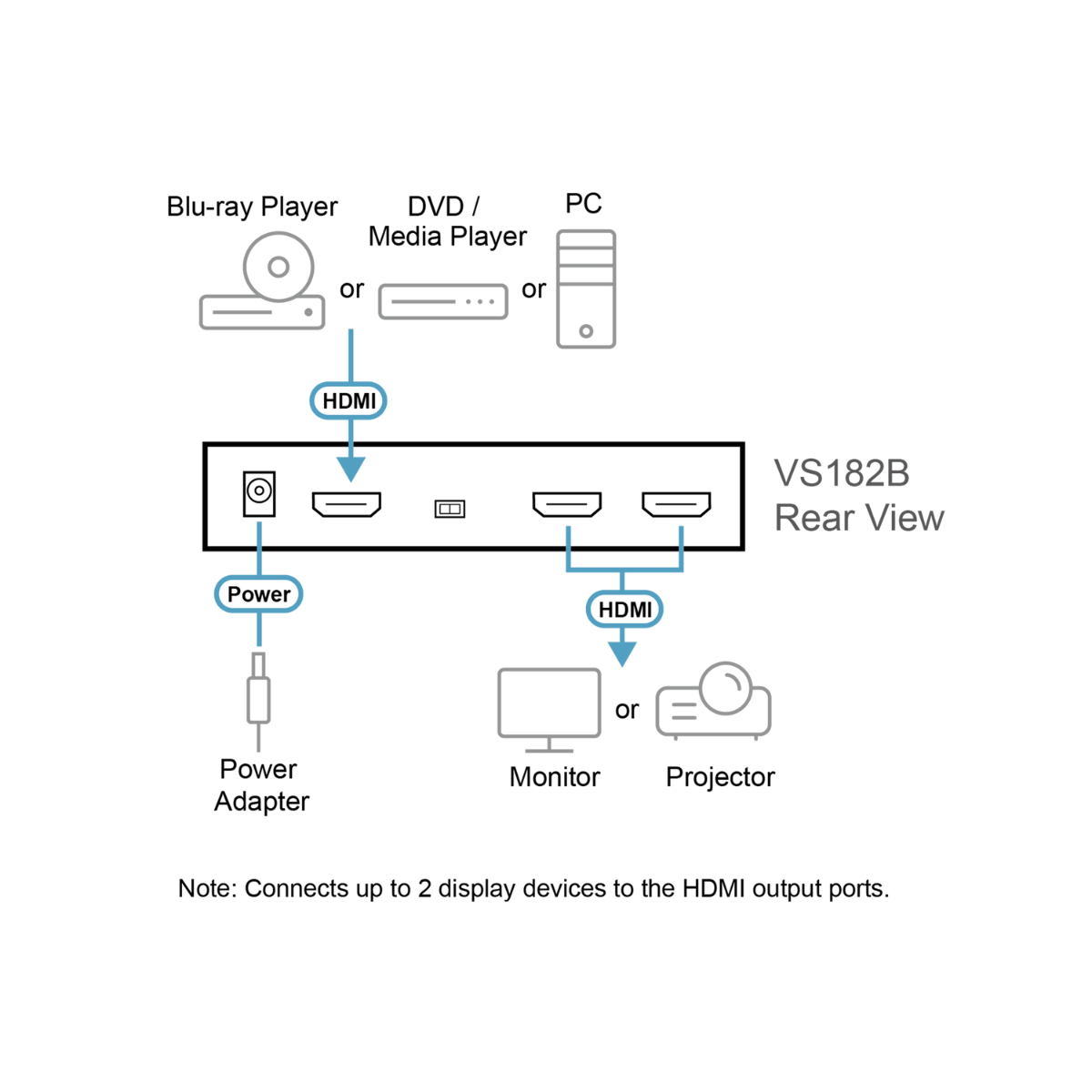 - 1 x VS182B 2-Port True 4K HDMI Splitter