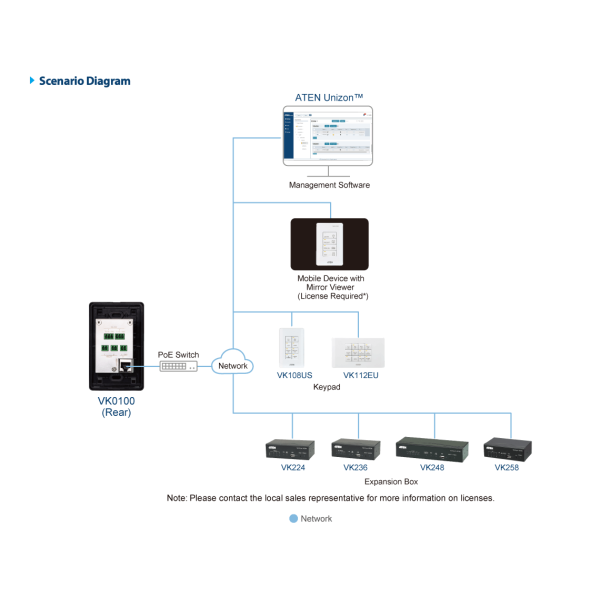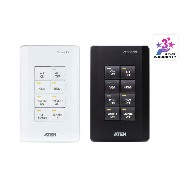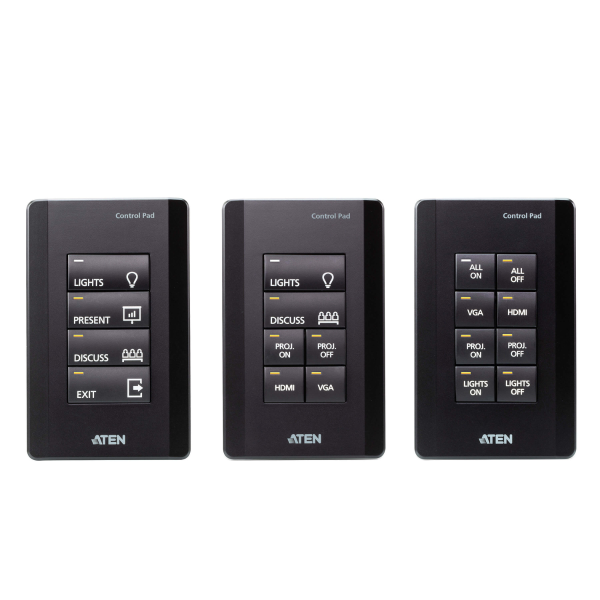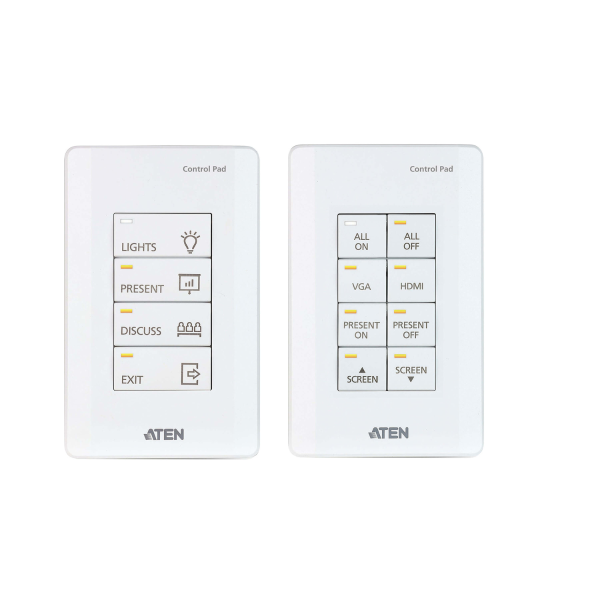 The ATEN Control System is an Ethernet-based management system that connects all the hardware devices found in a room for centralized control effortlessly. The VK0100 Control Pad not only plays the role as the main controller that connects the hardware devices, but also acts as a control interface with customizable buttons and layout. Created with flexibility in mind, the one-gang Control Pad can be laid out in 14 different combinations of 4 to 8 buttons that snap together as easy as Lego.By connecting to the local network, users will find it’s effortless using VK6000 software to configure the desired control of any connected device from the Control Pad. With the ready-to-go combo Control Pad, users have instant and smart control of the facilities from a Control Pad that can manage any device in the room.