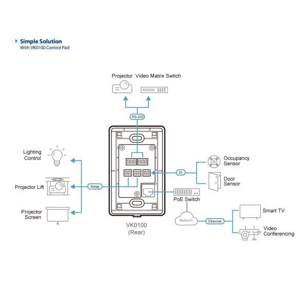 The VK0100 is a fully-customizable 8-button Control Pad that integrates a controller with a keypad as an all-in-one solution. Aimed for small / medium meeting room or classroom control, the VK0100 offers a ready-to-use solution that easily connects the devices, configures via the intuitive VK6000 Configurator Software, and flexibly customizes keypad button functions and layout to fulfill most applications.