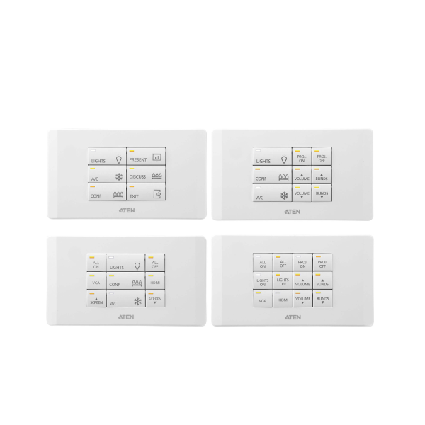 The VK112EU is a fully-customizable 12-button keypad designed for use with the ATEN Control System. The keypad provides an interface to control devices in a room from a standard wall mounted faceplate. Created with flexibility in mind, the 2-gang keypad can be laid out in 125 different combinations of 6 to 12 buttons that snap together as easy as Lego’s. By connecting to the VK2200 / VK1200 / VK2100A / VK1100A Control Box or VK0100 / VK0200 Control Pad over a LAN, users will find it’s effortless using VK6000 software to configure the desired control of any connected device from the keypad. With the buttons ready to go, users have instant and smart control of the facilities from a keypad or keypads that can manage any device in the room. The VK112EU is an affordable solution, perfect to serve as the primary interface in meeting rooms, or as secondary device control in classrooms and conference centers.