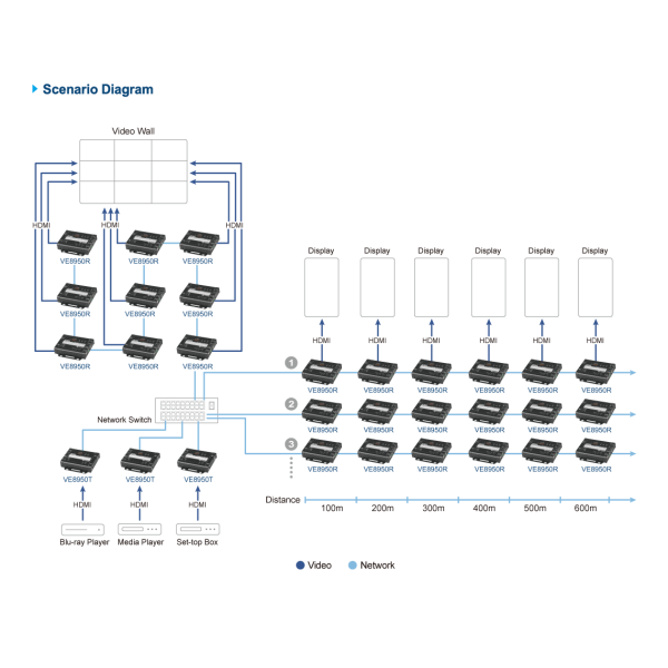 The VE8950R provides an effective, easy-to-use, and economical digital signage solution with the following features and advantages that directly address the challenges system integrators encounter when implementing AV over IP systems:
