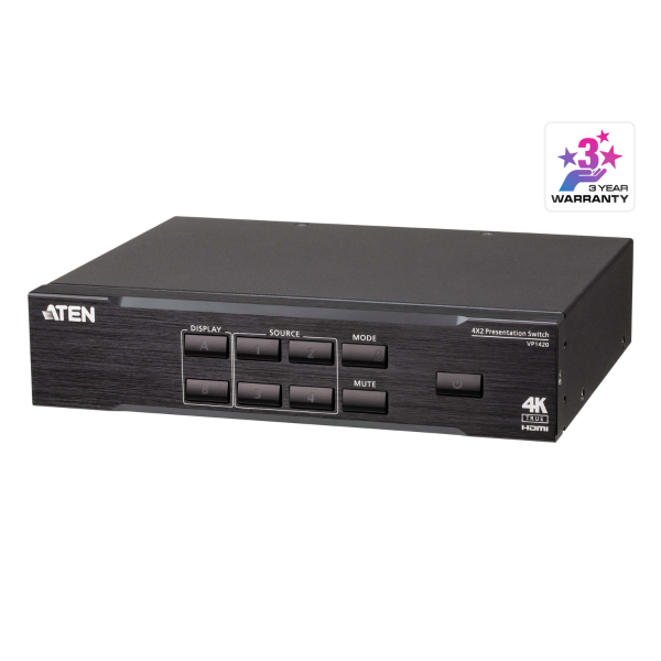 The ATEN VP1420 is a multi-in-one presentation switch that integrates a video matrix switch, True 4K scaler*, audio processor, and analog-to-digital converter functions into one compact device that easily mounts under a table or in a rack. With four analog/digital inputs to two HDMI True 4K outputs, it is designed to boost the efficiency and impact of professional presentations.