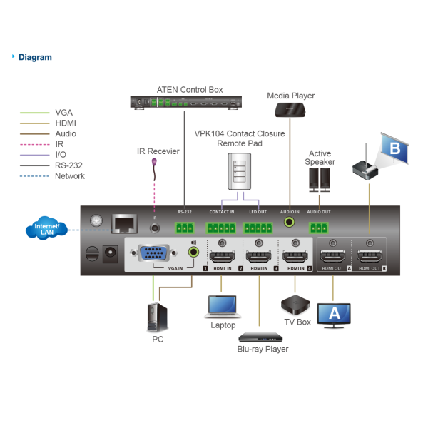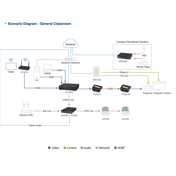 With streamlined control from front-panel pushbuttons, IR remote controller, RS-232, and web-based GUI via Ethernet, the VP1420 reduces not only system device count, but also lowers operation complexity. It is suitable for all meeting space and education environments, such as huddle rooms, classrooms, training rooms, or any other presentation setting, such as in exhibition galleries or hotels.