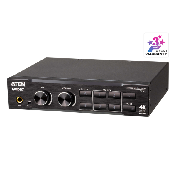 The ATEN VP1421 is a multi-in-one presentation switch that integrates a video matrix switch, 4K scaler *, HDBaseT extender, audio DSP, and analog-to-digital converter functions into one compact device that easily mounts under a table or in a rack. With four analog/digital inputs to one HDBaseT and one HDMI True 4K outputs, it is designed to boost the efficiency and impact of professional presentations.