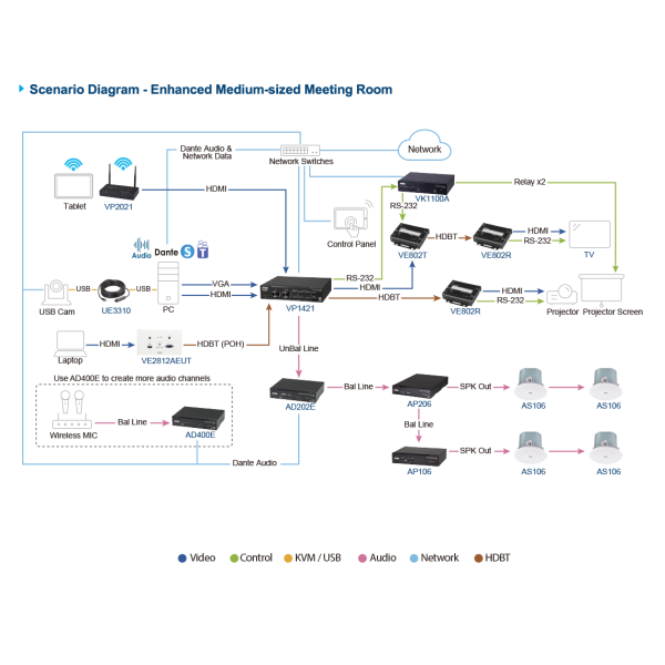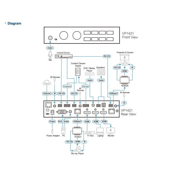 With streamlined control from front-panel pushbuttons, IR remote controller, RS-232, and web-based GUI via Ethernet, the VP1421 reduces not only system device count, but also lowers operation complexity. It is suitable for all meeting spaces and education environments, such as huddle rooms, classrooms, training rooms, or any other presentation setting, such as in exhibition galleries or hotels.