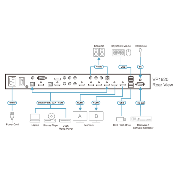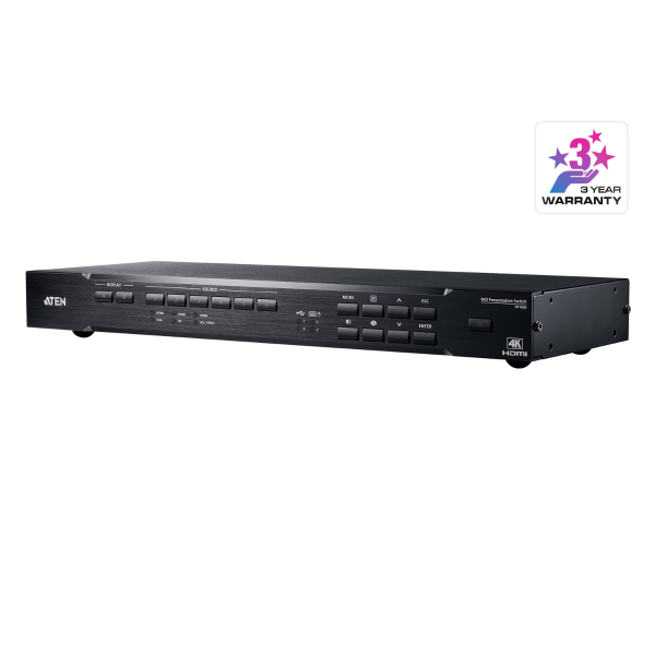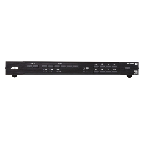 The ATEN VP1920 is a 3-in-1 presentation switch that integrates a video matrix switch, an audio processor, and analog-to-digital converter functions. With nine multi-format inputs to two HDMI 4K outputs, it is designed to boost the efficiency and impact of professional presentations.