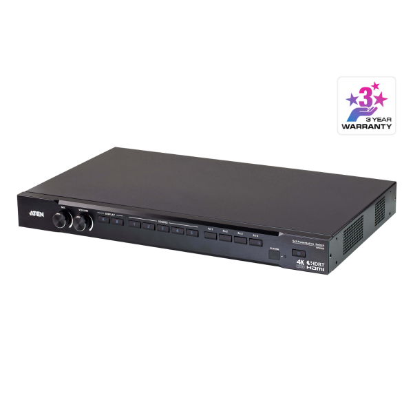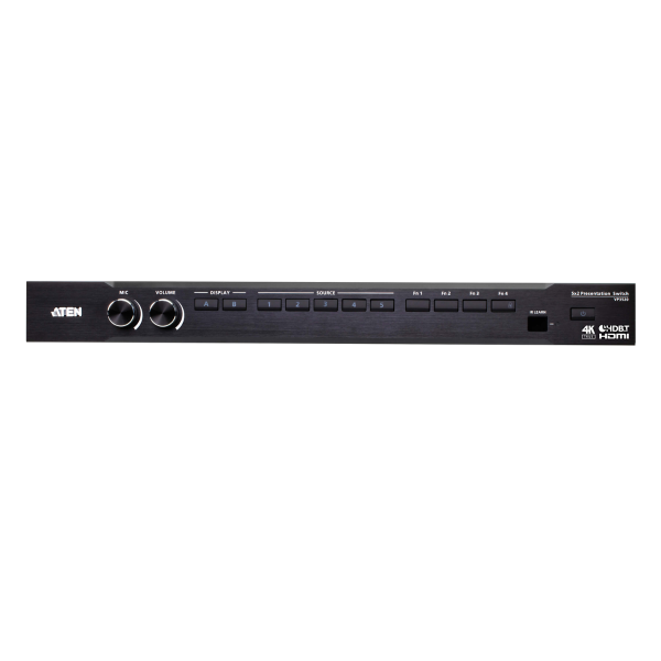 The ATEN VP3520 is a multi-in-one presentation matrix switch that integrates a video matrix switch, 4K scaler, HDBaseT extender, and audio DSP functions into one compact device that easily mounts under a table or in a rack. The VP3520 seamless presentation matrix switch with control features the True 4K video resolutions of 4096 x 2160 / 3840 x 2160 @ 60 Hz (4:4:4) and HDR technology, guaranteeing crystal-clear images across two displays. The VP3520 supporting 4K @ 60 Hz, HDMI, and HDCP 2.2 features Seamless Switch™ that employs an FPGA matrix architecture that ensures continuous video streams, real-time control, and stable signal transmissions. With a built-in high-performance 4K scaler, the VP3520 easily converts various input resolutions into various output display resolutions, giving viewers the best video and picture quality across the two displays.
