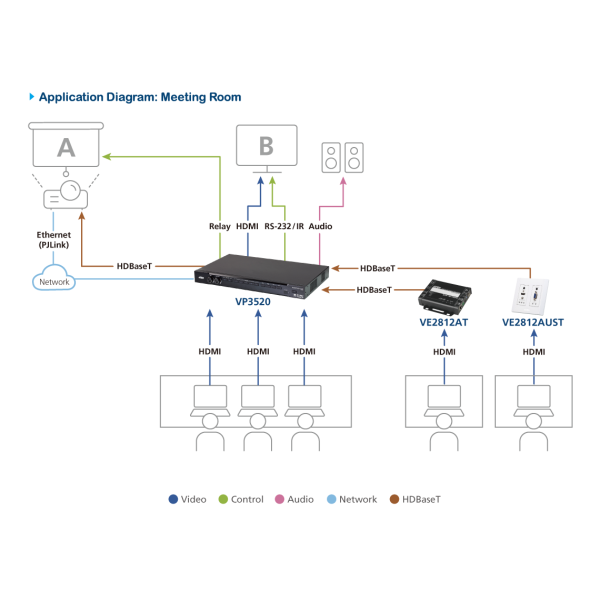 As for the control functions, the VP3520 offers users multiple control options through the front-panel pushbuttons, IR remote control, RS-232 commands, web-based GUI, and ATEN Video Presentation Control App. Moreover, the VP3520 enables the control over AV devices such as TV displays, projectors, and monitors. It is ideal for all meeting spaces and education environments, including huddle rooms, classrooms, training rooms, or any other presentation setting such as exhibition galleries or hotels.