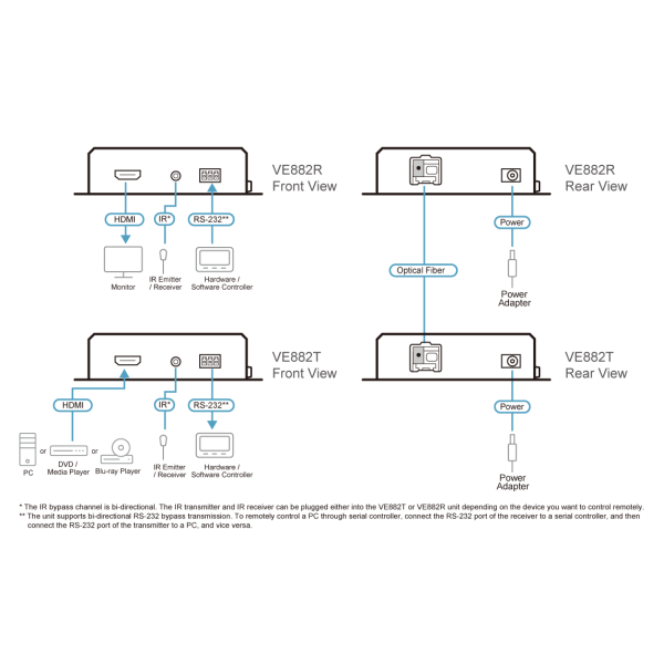 The VE882 can also extend the IR remote control and transfer RS-232 (up to 115kbps) in both directions, allows you to connect serial devices such as touch screens and barcode scanners.