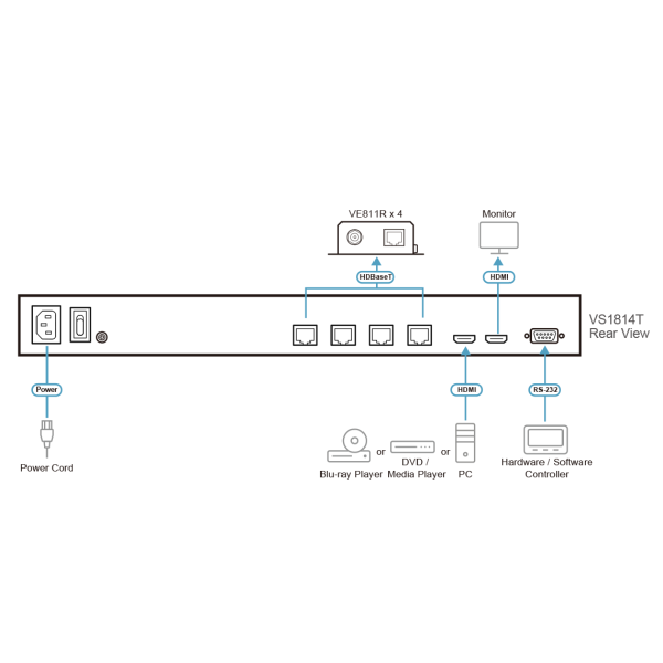 - 1x VS1814T 4-Port HDMI HDBaseT Splitter