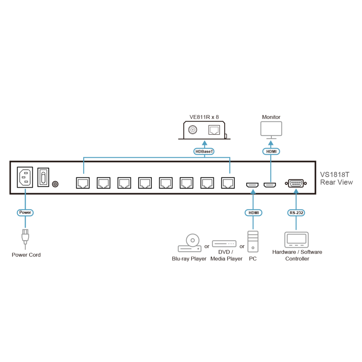The solution implements HDBaseT extension technology to connect the VS1818T to receiver units over one single Cat 6 cable in order to transmit rich HDMI multimedia content in real time. It supports up to 4k2k resolution, and features an EDID selection method to ensure constant and reliable EDID data relay for the HDMI source device to efficiently optimize video resolution.